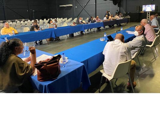 WILLEMSTAD, 24 di sèptèmber 2020 – Durante e enkuentro di CGOA ku a tuma lugá awe mèrdia den sala di reunion grandi den edifisio di PWFC, Minister di Finansa sr. Kenneth Gijsbertha, kompañá pa su tim di konseheronan, a duna un presentashon riba e plan pa riba término korto lanta un organisashon di impuesto nobo (Nieuwe Belastingorganisatie, NBO).